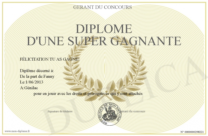 Envoyez par email votre Diplôme d'une super gagnante personalisé