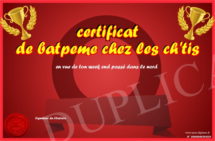 Envoyez par email votre certificat de batpeme chez les ch'tis personalisé