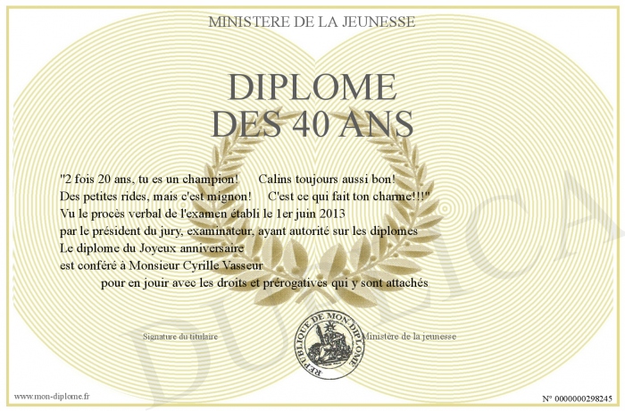 Envoyez par email votre Diplôme des 40 ans personalisé