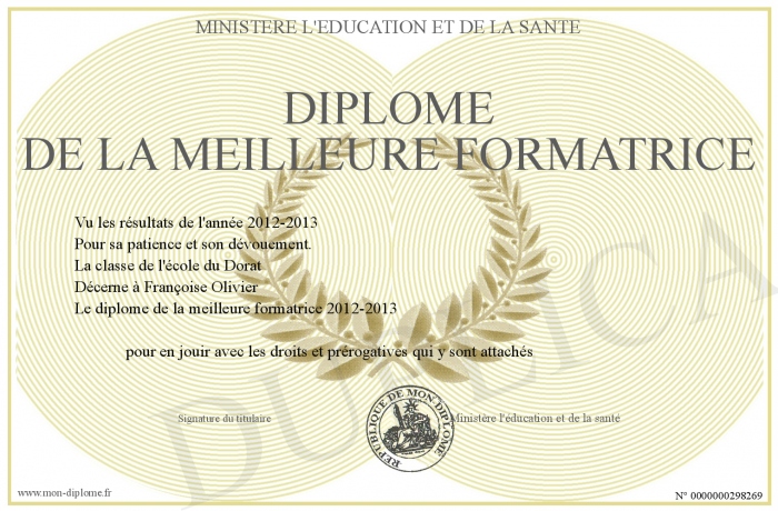 Envoyez par email votre Diplôme de la meilleure formatrice personalisé