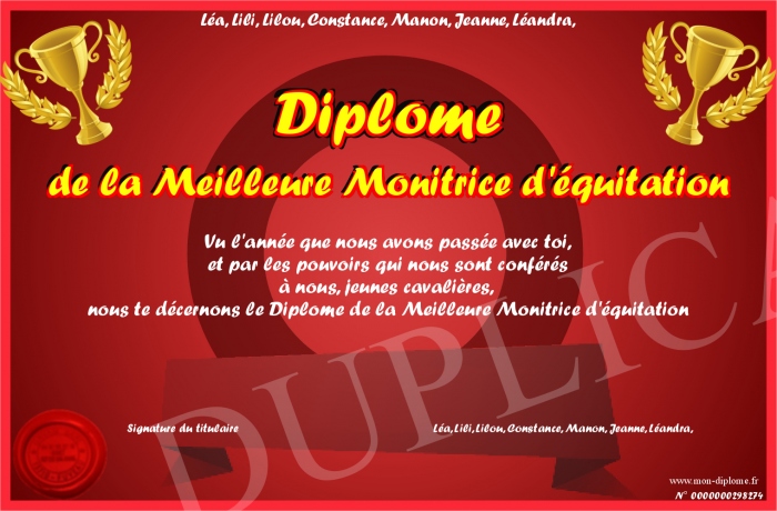 Envoyez par email votre Diplôme de la Meilleure Monitrice d'équitation personalisé