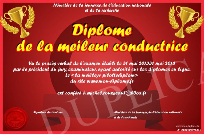 Envoyez par email votre Diplôme de la meileur conductrice personalisé