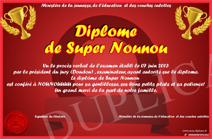 Envoyez par email votre Diplôme de Super Nounou personalisé