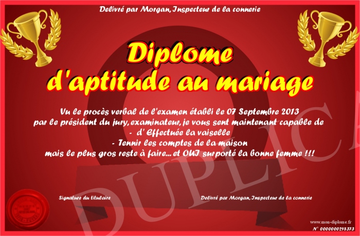 Envoyez par email votre Diplome d'aptitude au mariage personalisé