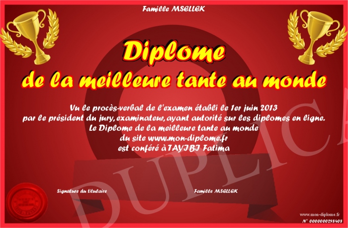 Envoyez par email votre Diplôme de la meilleure tante au monde personalisé