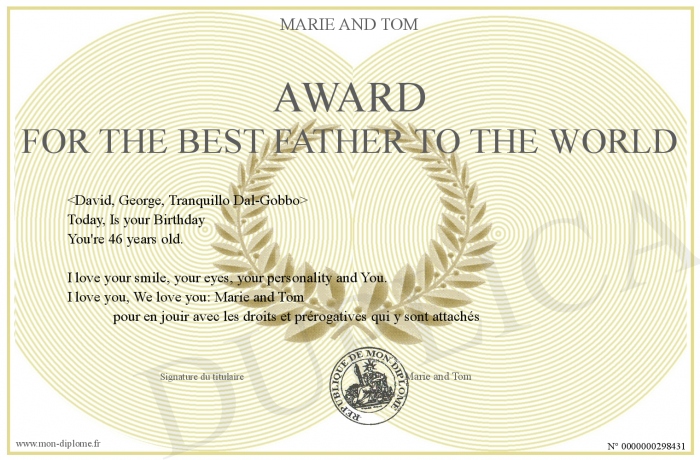 Envoyez par email votre Award For The Best Father To The World personalisé