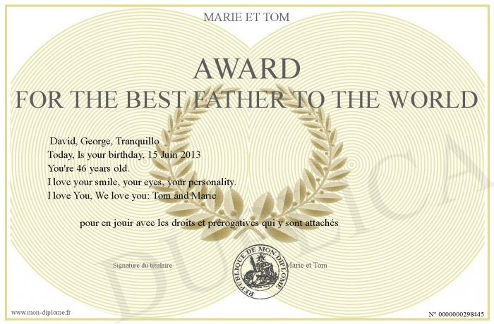Envoyez par email votre Award For The Best Father To The World personalisé