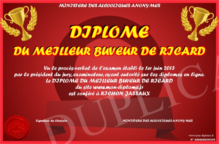 Envoyez par email votre DIPLOME DU MEILLEUR BUVEUR DE RICARD personalisé