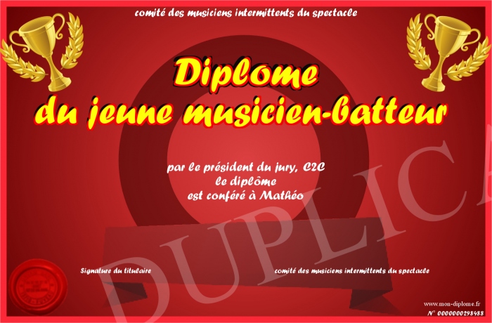 Envoyez par email votre Diplôme du jeune musicien-batteur personalisé