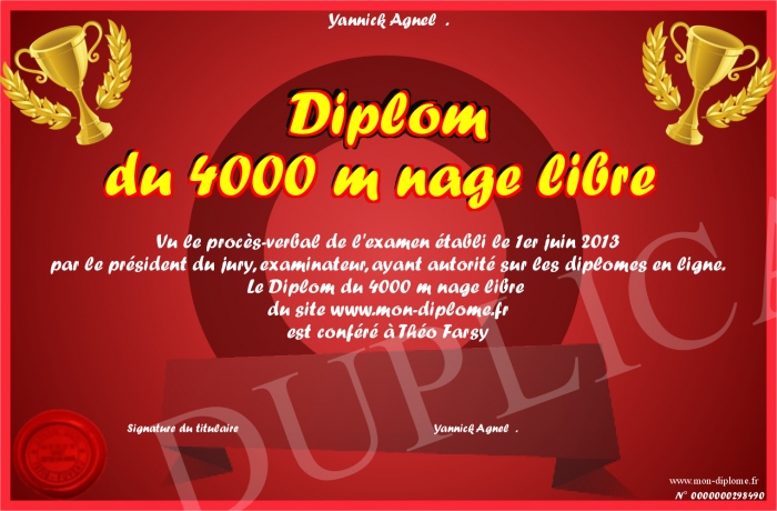 Envoyez par email votre Diplom du 4000 m nage libre personalisé