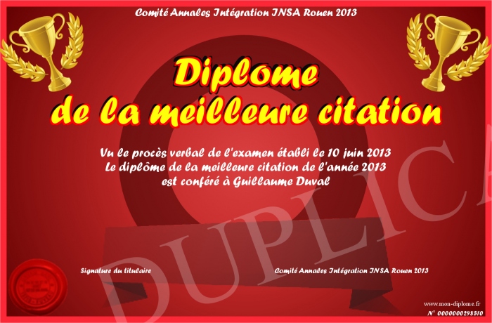 Envoyez par email votre Diplome de la meilleure citation personalisé