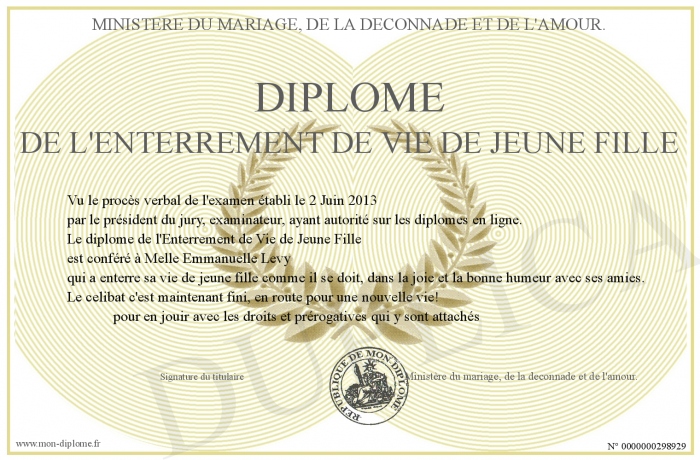 Envoyez par email votre Diplôme de l'Enterrement de Vie de Jeune Fille personalisé