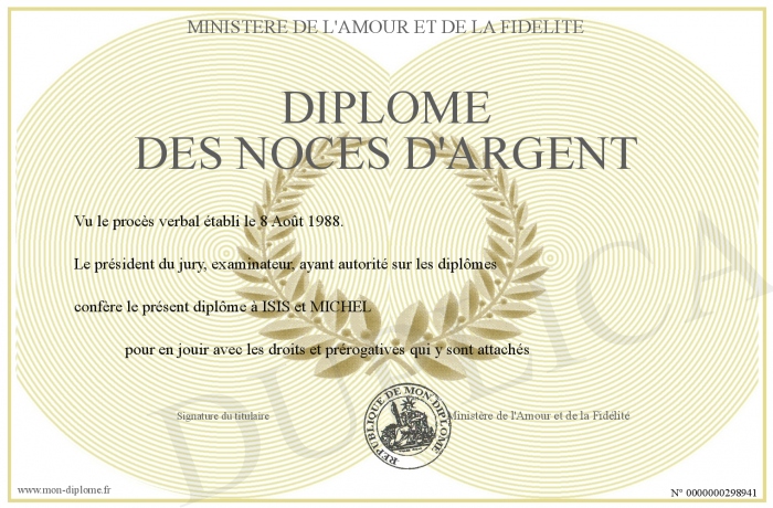 Envoyez par email votre Diplôme des Noces d'Argent personalisé