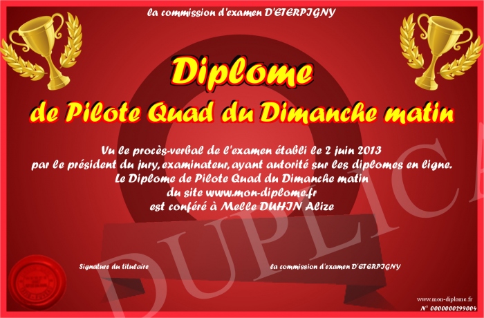 Envoyez par email votre Diplôme de Pilote Quad du Dimanche matin personalisé