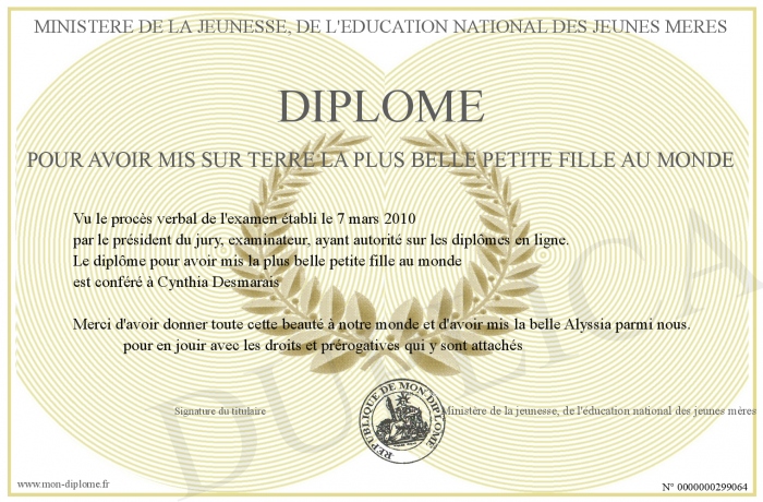 Envoyez par email votre Diplôme pour avoir mis sur terre la plus belle petite fille au monde personalisé