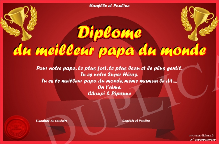 Envoyez par email votre Diplôme du meilleur papa du monde personalisé