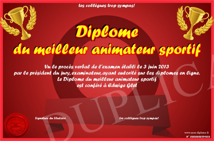 Envoyez par email votre Diplôme du meilleur animateur sportif personalisé