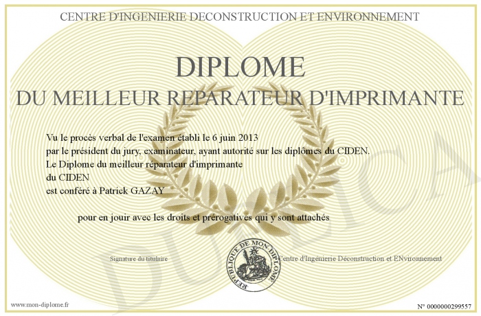 Envoyez par email votre Diplôme du meilleur réparateur d'imprimante personalisé