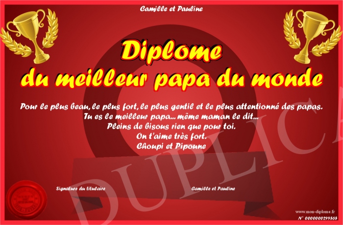Envoyez par email votre Diplôme du meilleur papa du monde personalisé