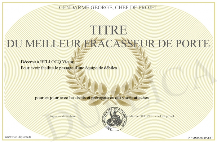 Envoyez par email votre TITRE DU MEILLEUR FRACASSEUR DE PORTE personalisé
