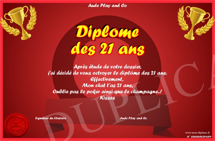 Envoyez par email votre Diplôme des 21 ans personalisé