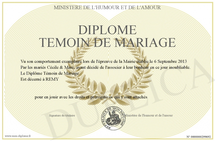 Envoyez par email votre Diplôme Témoin de Mariage personalisé
