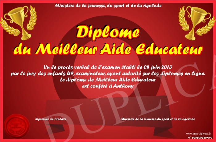 Envoyez par email votre Diplôme du Meilleur Aide Educateur personalisé