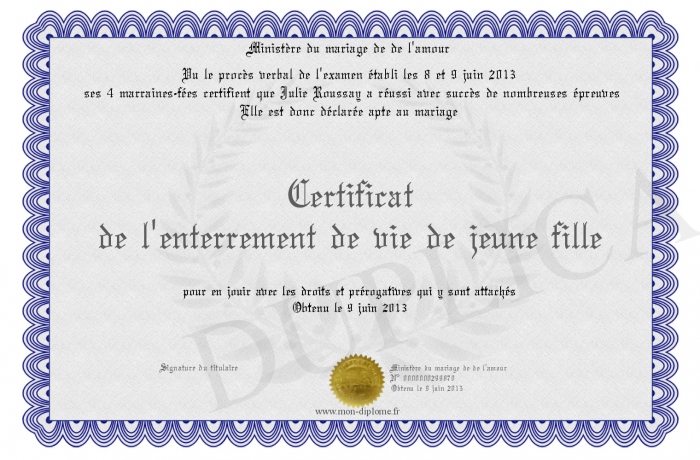 Envoyez par email votre Certificat de l'enterrement de vie de jeune fille personalisé