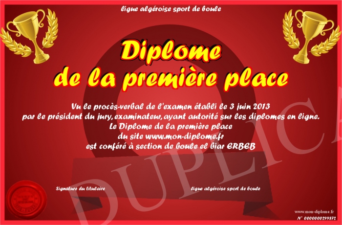 Envoyez par email votre Diplôme de la première place personalisé