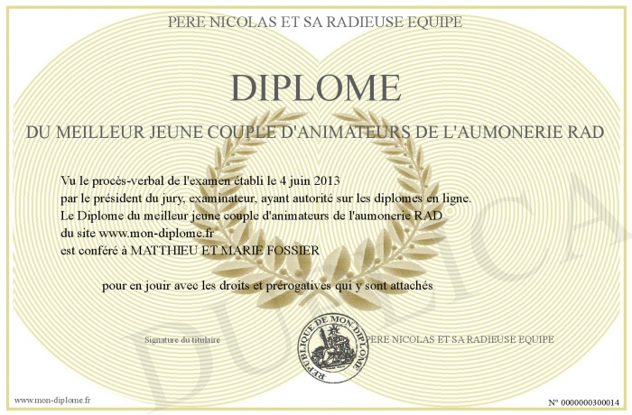 Envoyez par email votre Diplôme du meilleur jeune couple d'animateurs de l'aumônerie RAD personalisé