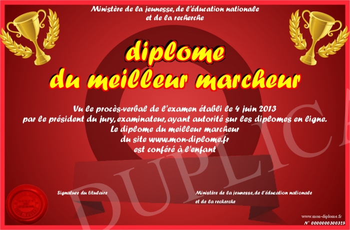 Envoyez par email votre diplôme du meilleur marcheur personalisé