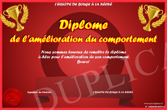 Envoyez par email votre Diplôme de l'amélioration du comportement personalisé