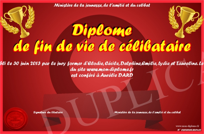 Envoyez par email votre Diplôme de fin de vie de célibataire personalisé