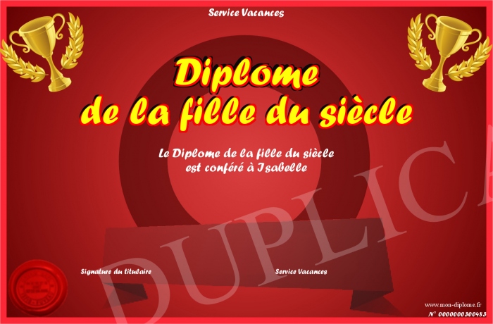 Envoyez par email votre Diplôme de la fille du siècle personalisé