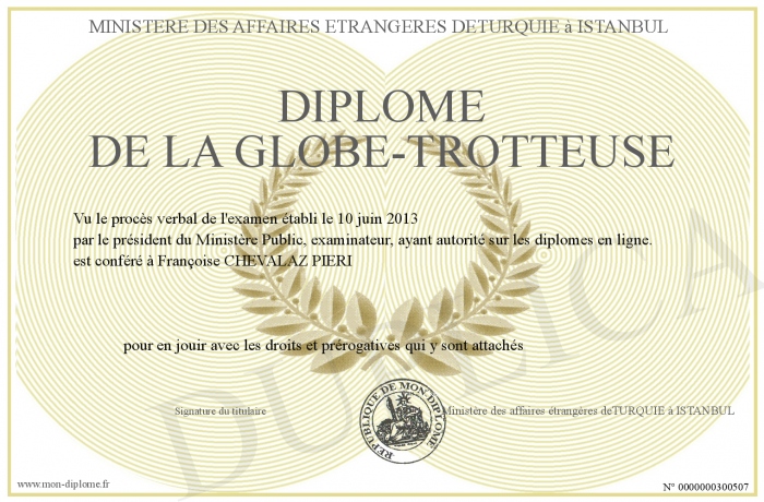 Envoyez par email votre Diplôme de la Globe-Trotteuse personalisé