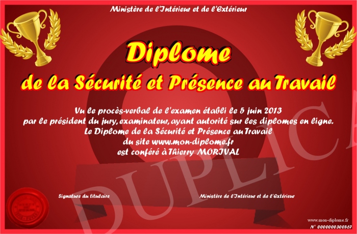 Envoyez par email votre Diplôme de la Sécurité et Présence au Travail personalisé