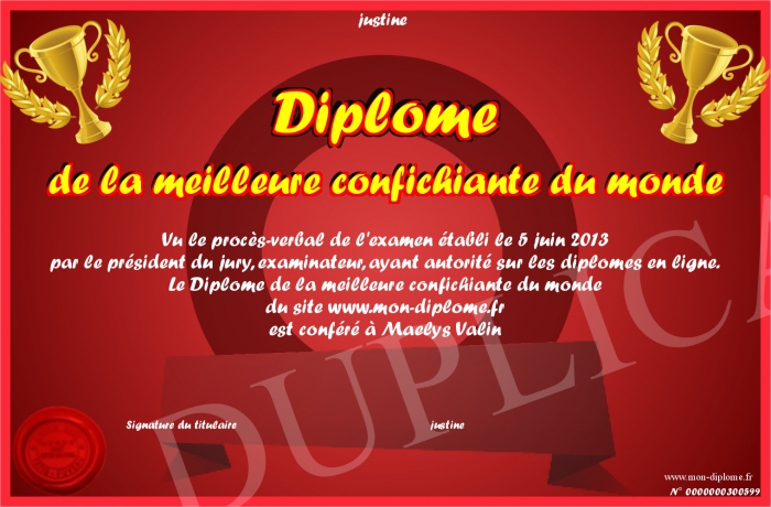 Envoyez par email votre Diplôme de la meilleure confichiante du monde personalisé