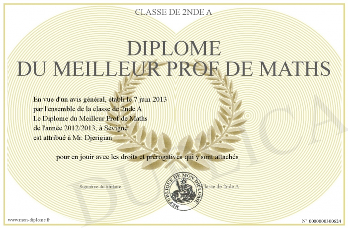 Envoyez par email votre Diplôme du Meilleur Prof de Maths personalisé