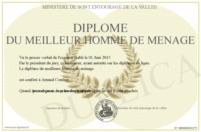 Envoyez par email votre Diplôme du meilleur homme de ménage personalisé