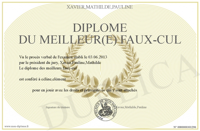 Envoyez par email votre Diplôme du meilleur(e) faux-cul personalisé