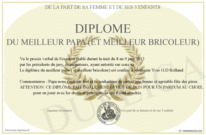 Envoyez par email votre Diplôme du meilleur papa (et meilleur bricoleur) personalisé