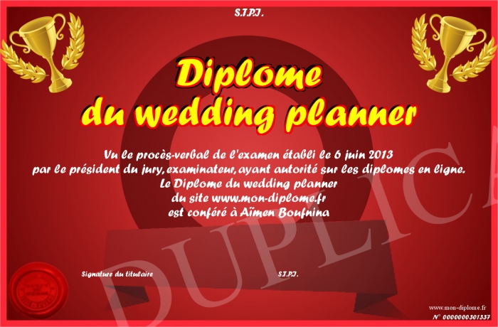 Envoyez par email votre Diplôme du wedding planner personalisé
