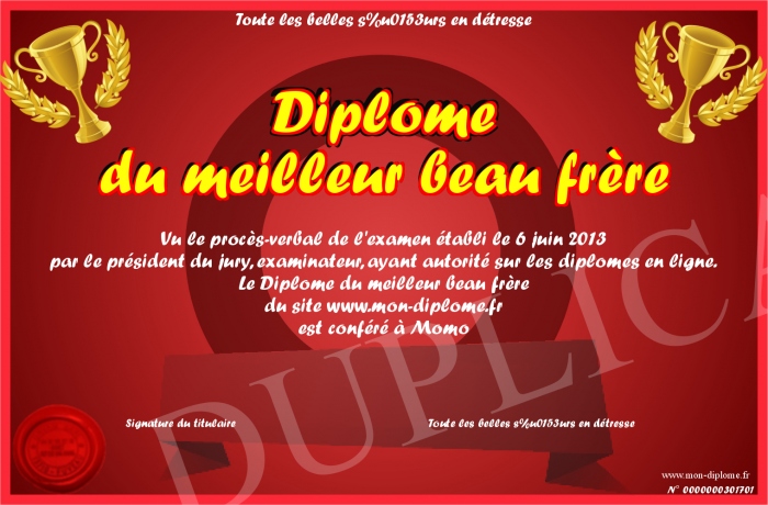 Envoyez par email votre Diplôme du meilleur beau frère personalisé