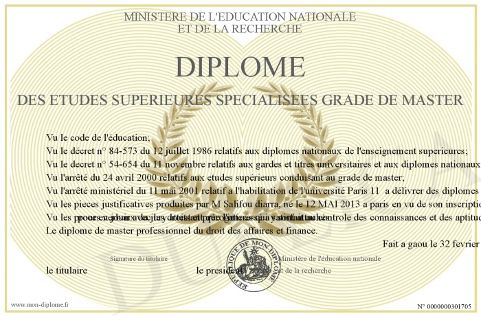 Envoyez par email votre DIPLOME DES ETUDES SUPERIEURES SPECIALISEES GRADE DE MASTER personalisé