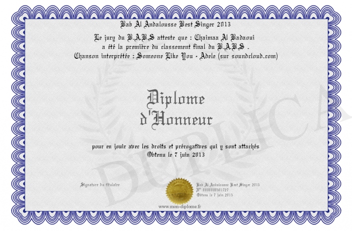 Envoyez par email votre Diplôme d'Honneur personalisé