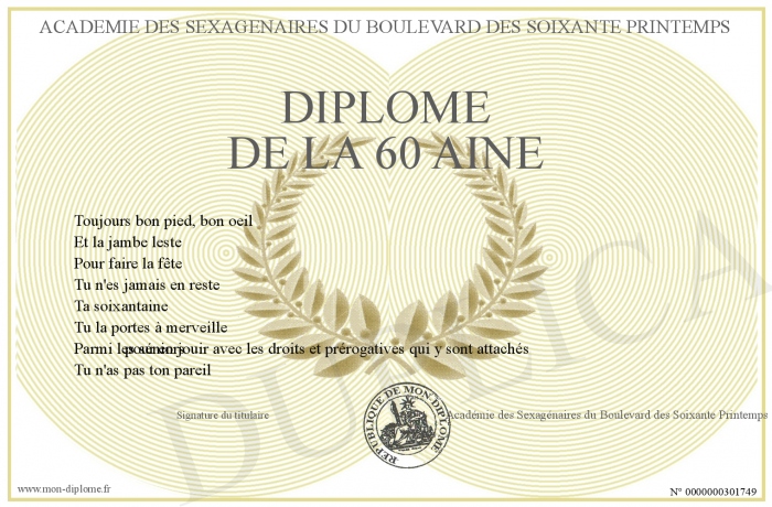 Envoyez par email votre Diplôme de la 60 aine personalisé