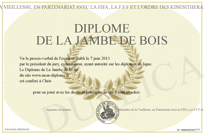 Envoyez par email votre Diplôme de La Jambe de BOis personalisé