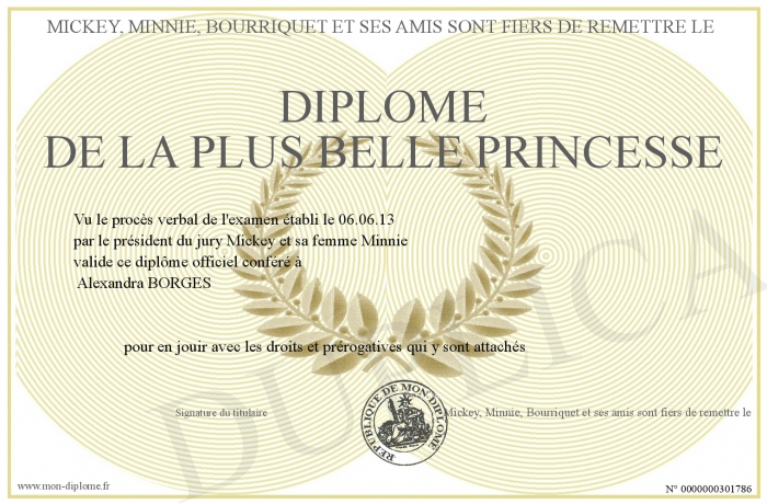 Envoyez par email votre Diplôme de la plus belle Princesse personalisé