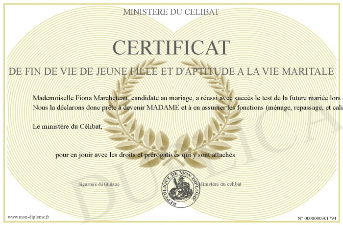 Envoyez par email votre Certificat de fin de vie de jeune fille et d'aptitude a la vie maritale personalisé