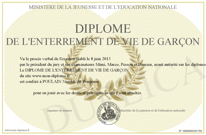 Envoyez par email votre DIPLOME DE L'ENTERREMENT DE VIE DE GARÇON personalisé